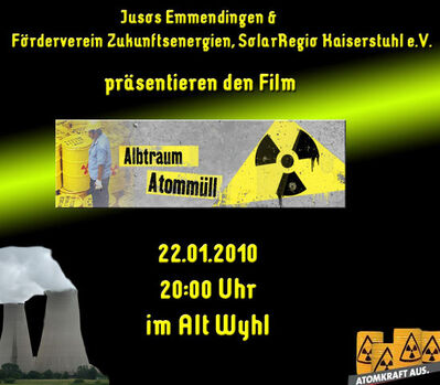 Die Jusos im Kreis Emmendingen und der Förderverein Zukunftsenergien SolarRegio Kaiserstuhl eV laden herzlich zur Vorführung des Films "Albtraum Atommmüll" mit anschließender Diskussionsrunde ein. Die Veranstaltung findet am Freitag, den 22.01.2010 um 20 Uhr im Altwyhl statt